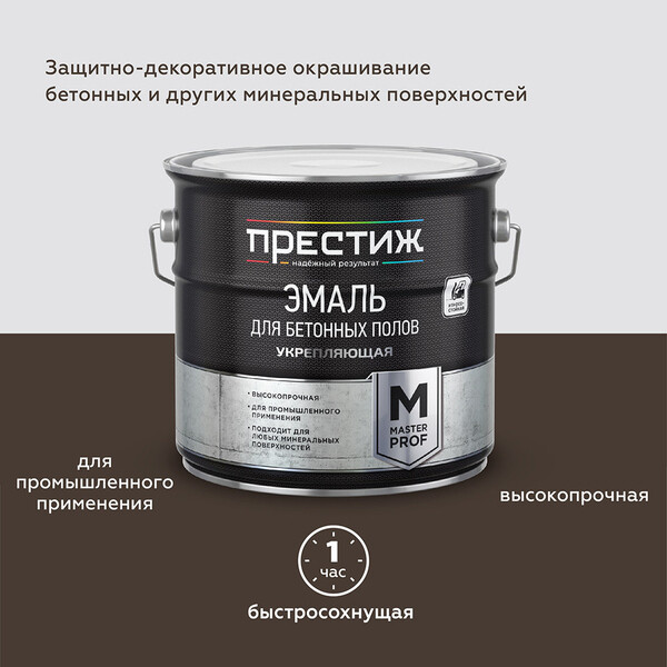 Эмаль укрепляющая для бетонных полов. Высокопрочная. Для промышленного применения. Подходит для любых минеральных поверхностей. Защитно-декоративное окрашивание бетонных и других минеральных поверхностей. Для работ снаружи и внутри помещения. Высокая стойкость к химическим реагентам и износостойкость позволяют использовать эмаль для окраски бетонных поверхностей в цехах, лабораториях, складских и производственных помещениях. Легко наносится, хорошо растекается по поверхности пола, выравнивая мелкие неровности. После высыхания образует гладкое покрытие, стойкое к мытью и истиранию, продолжительному воздействию воды и растворов моющих средств. Атмосферостойкая. Укрепляет, предотвращает пылеотделение. Выпускается различных цветов.