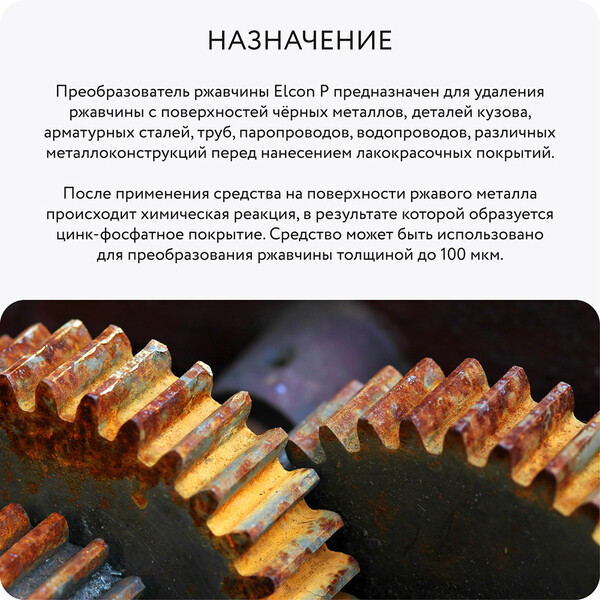 Средство для преобразования ржавчины на основе водного раствора неорганической кислоты. Преобразователь ржавчины Elcon P предназначен для предварительной обработки прокорродировавшей поверхности черных металлов со слоем плотно сцепленных с поверхностью продуктов коррозии толщиной до 100 мкм перед нанесением защитного лакокрасочного покрытия.