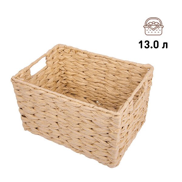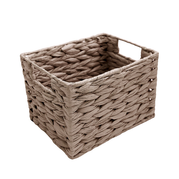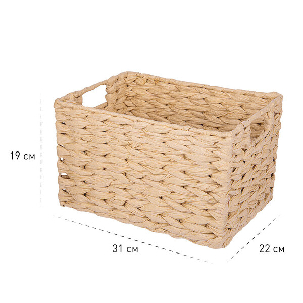 Плетеная стеллажная корзина прямоугольной формы станет прекрасным дополнением интерьера и отличным функциональным решением для хранения вещей. Корзина сплетена из скрученной в жгуты бумаги, что визуально похоже на плетение из водного гиацинта.