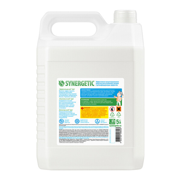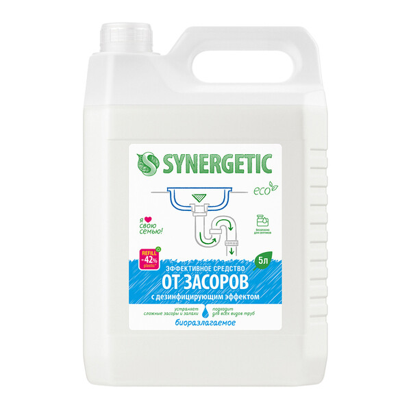 Концентрированное средство для устранения засоров Synergetic – высокоэффективное средство, подходящее для любых видов засоров и канализационных труб. Устраняет запахи и обладает дезинфицирующим эффектом, справляется с засорами даже в стоячей воде. Комплекс биоразлагаемых растительных А-тензидов и соды удаляет засоры всего за полчаса. Кальцинированная сода создает необходимую для растворения засора щелочную среду и быстро расщепляет масложировые компоненты. Биоразлагаемое средство не содержит хлора, ароматизаторов, красителей и агрессивных ПАВ, оно безопасно для всех видов труб и септических установок. Попадая в среду септика, средство понятно для микроорганизмов и без труда распадается на простые соединения.