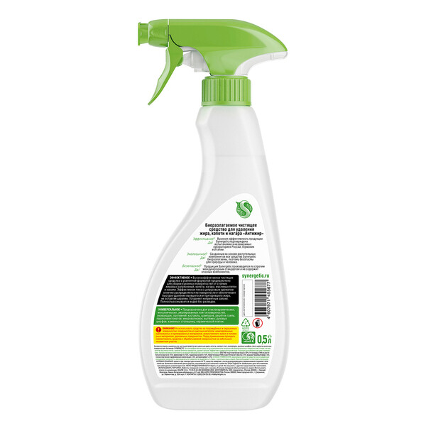 Высокоэффективное чистящее средство "Антижир" Synergetic с усиленной формулой предназначено для уборки кухонных поверхностей от стойких жировых загрязнений, копоти, нагара, масляных пятен и накипи. Предназначено для стеклокерамических, металлических, эмалированных плит и поверхностей, сковородок, противней, кастрюль, шампуров, решеток-гриль, пароконвектоматов, микроволновок, вытяжек, духовых шкафов, каменных столешниц, керамической плитки и других кухонных поверхностей. Эффективная стойкая пена отлично распределяется по поверхности и обеспечивает быстрое удаление въевшегося и пригоревшего жира, не оставляя царапин. Обладает свежим цитрусовым ароматом благодаря гипоаллергенной парфюмерной композиции с эфирными маслами мандарина, лемонграсса, лимона, апельсина и перечной мяты. Средство устраняет неприятные запахи, эффективно даже в холодно...
