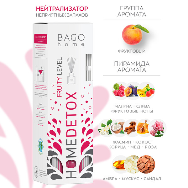 Ароматический диффузор для дома – это нейтрализатор неприятных запахов из эксклюзивной уникальной коллекции Homedetox позволит очистить воздух на молекулярном уровне, наполнив его приятным ароматом. Он создан на натуральной растительной основе по сертифицированной европейской технологии уничтожения молекул неприятного запаха Metazene, безопасен для людей, животных и окружающей среды. Этот аромадиффузор с палочками не просто ароматизатор, а настоящий борец за идеальную чистоту воздуха в доме. Лаконичный и стильный дизайн упаковки идеально дополнит интерьер каждой комнаты. А гармоничные композиции ароматов создадут особую атмосферу, подчеркнув индивидуальность вашего дома. В отличие от электрических ультразвуковых диффузоров он не потребляет электричества, вам нужно просто вставить палочки.