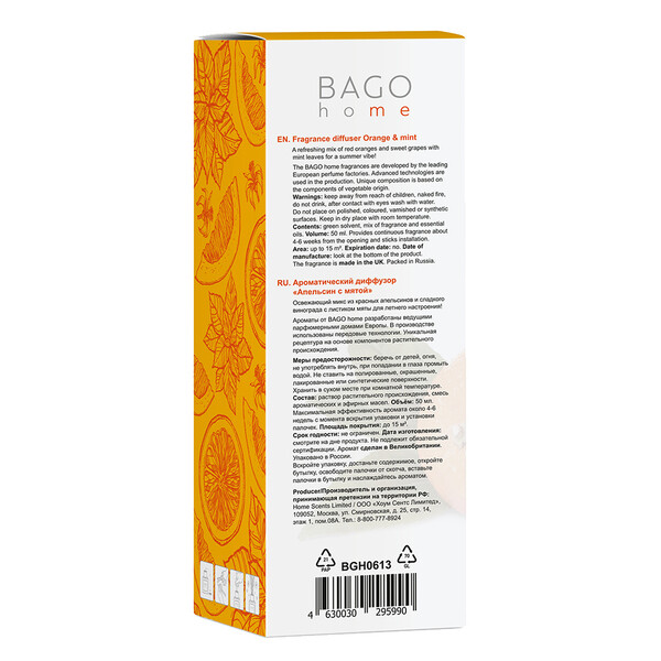 Аромадиффузор с палочками Bago home Апельсин с мятой 50 мл