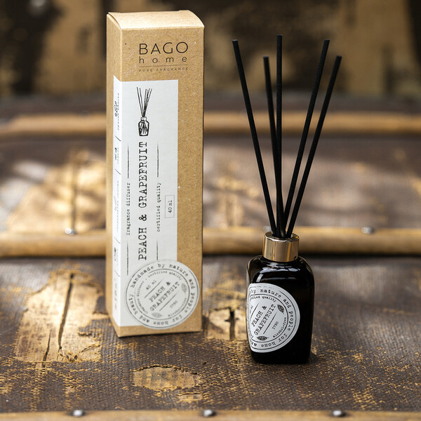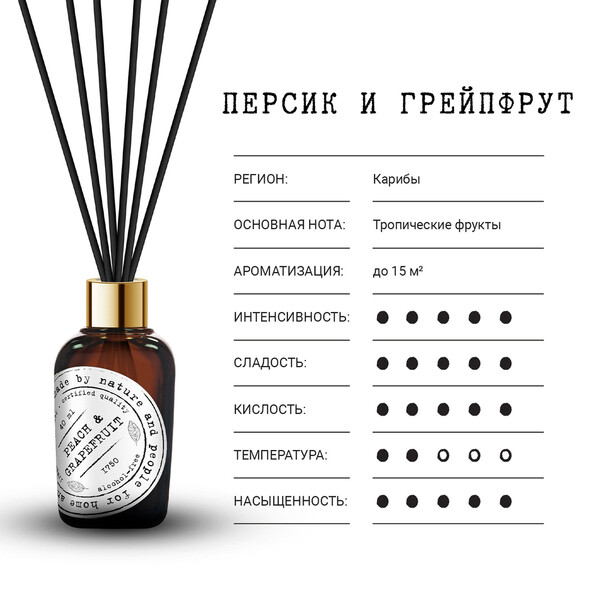 Ароматический диффузор Персик и грейпфрут 40 мл из коллекции ароматов Nature. Сочный персик в сочетании с яркой цитрусовой нотой грейпфрута, приправленный ароматной кондитерской ванилью. В комплекте 5 фибровых палочек из прессованного волокна. Время работы – от 4 до 6 недель. Площадь ароматизации – 15 м?.