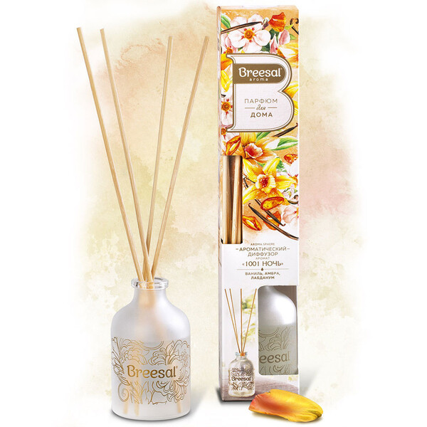 Предназначен для ароматизации, декора помещения и устранения неприятных запахов. Композиция ароматического диффузора «1001 ночь» от Breesal — теплая и пряная, наполненная нотами ванили, амбры и лабданума, такой ароматизатор наполняет вас чувственностью и негой. Распространяясь по комнате с помощью ротанговых палочек, она переносит вас в мир роскошных восточных благовоний. Утонченный дизайн матового флакона с золотым орнаментом легко впишется в любой интерьер.