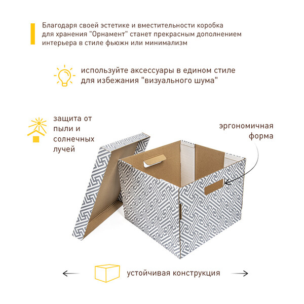 Складная коробка гардеробная с крышкой "Орнамент" позволяет эффективно организовать пространство в помещении. Изделие предназначено для хранения одежды, книг, игрушек и прочих вещей. Конструкция короба складная, поэтому в сложенном виде он занимает минимум места.