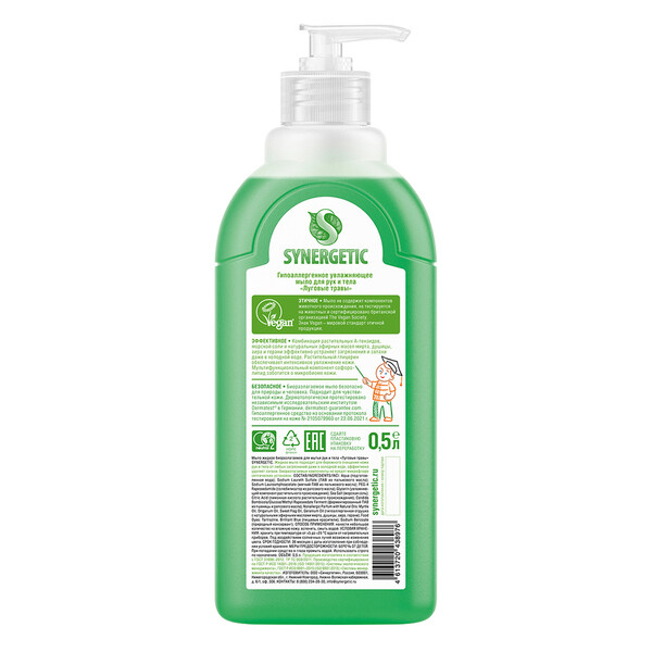Биоразлагаемое увлажняющее мыло Synergetic "Луговые травы" подходит для бережного очищения кожи рук и тела от любых загрязнений. Комбинация растительных А-тензидов, морской соли и натуральных эфирных масел мирта, душицы, аира и герани эффективно устраняет загрязнения и неприятные запахи даже в холодной воде. Растительный глицерин обеспечивает интенсивное увлажнение кожи. Мультифункциональный компонент софоролипид мягко очищает и заботится о естественном микробиоме кожи. Гипоаллергенное средство подходит для чувствительной кожи.