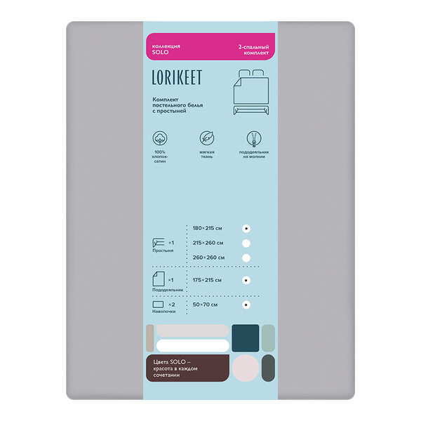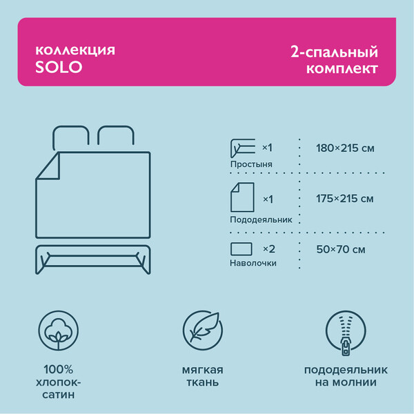 Комплект постельного белья из коллекции Solo выполнен из высококачественного хлопкового сатина. Пододеяльник в комплекте оснащен застежкой на молнии для дополнительной фиксации одеяла.