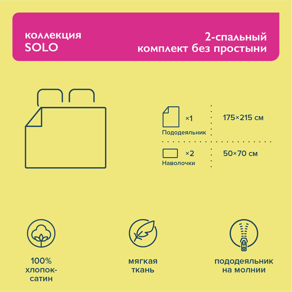 Комплект постельного белья из коллекции Solo выполнен из высококачественного хлопкового сатина. Пододеяльник в комплекте оснащен застежкой на молнии для дополнительной фиксации одеяла. Дополните Ваш комплект простыней с резинкой или без резинки. Широкий размерный ряд простыней позволит выбрать оптимальный вариант для любого спального места. Авторская палитра цветов позволяет комбинировать разные изделия и комплекты между собой, создавая гармоничный и законченный дизайн Вашего постельного белья. Коллекция Solo – красота в каждом сочетании!