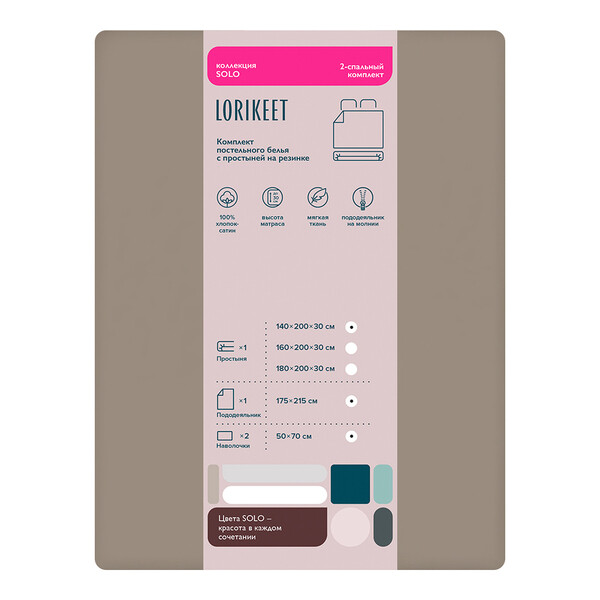 Комплект постельного белья 2-спальный сатин Lorikeet Solo латте с простыней на резинке 140х200х30 см
