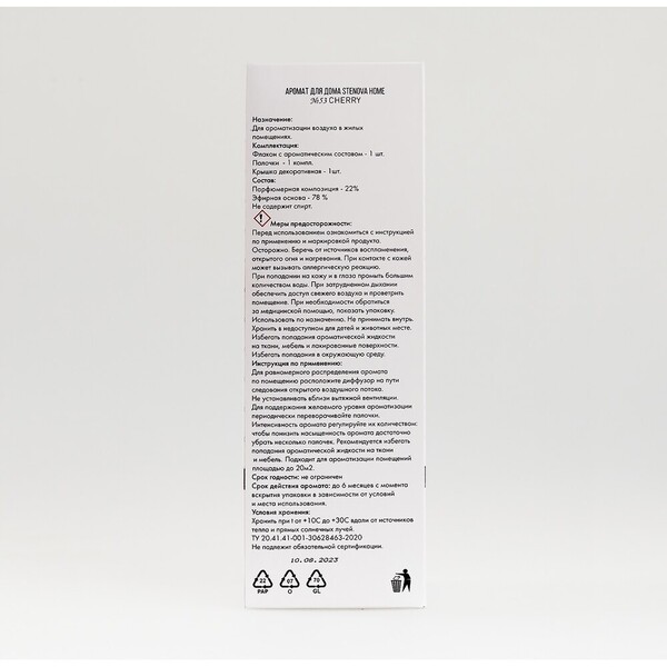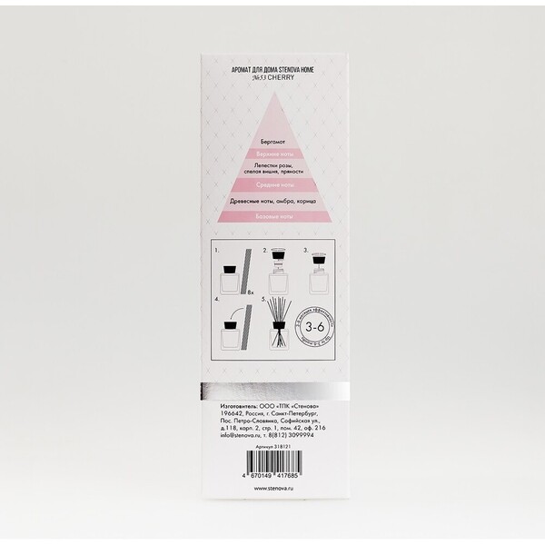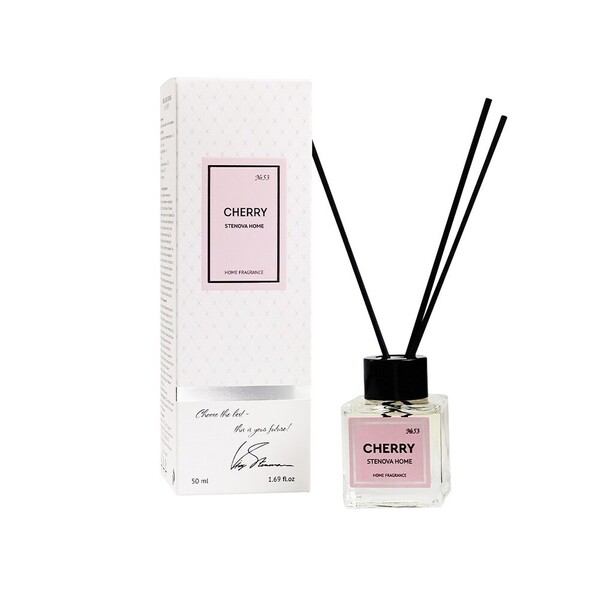 Аромат для дома №53 Cherry – гурманский, вишневый, соблазнительный, пряный и густой, с теплыми древесными нотками и сочным вареньем из лепестков роз. В каждой упаковке находится комплект из 8-ми палочек из микрофибры и сам флакон, наполненный ароматической композицией.