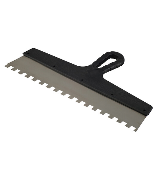Предназначен для нанесения и распределения клеевых растворов и создания на их поверхности гребенчатой структуры при укладке керамической плитки, декоративного камня и др. Шпатель зубчатый служит для того, чтобы клеевая масса разравнивалась до одинаковой толщины слоя по всей площади материала без образования пустот. Рабочее полотно шпателя изготовлено из нержавеющей стали.