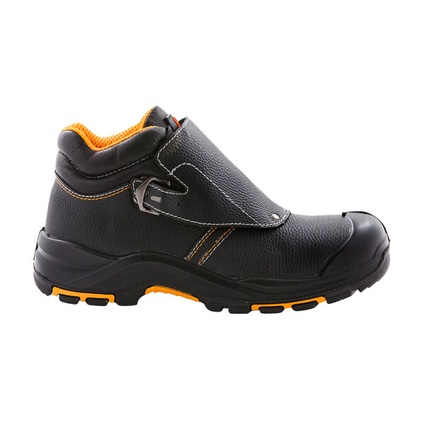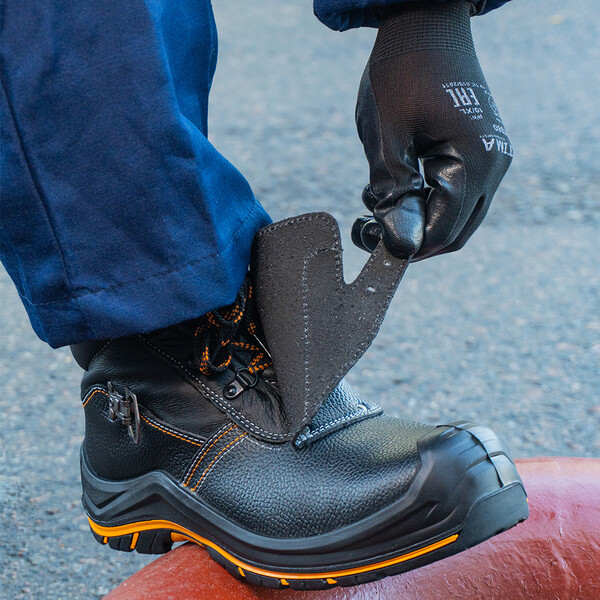 Ботинки "Сварщика" отлично подойдут для использования при сварочных работах. Обувь изготовлена методом прямого литья. Защитный кожаный клапан защищает шнуровку и фиксируется ремешком с пряжкой. Носок из поликарбоната обеспечивает защиту от ударов в носочной части 200 Дж и проколов. Материал верха обуви, термостойкая водоотталкивающая кожа толщиной 1,8 – 2 мм, со специальным покрытием, которая защищает от контактов с агрессивной средой: нефть, растворы кислот и щелочной концентрации до 20%, общих производственных загрязнений. Подошва двухслойная, полиуретан и нитрильная резина, устойчива к контакту с нагретой поверхностью, до 300 градусов Цельсия, с улучшенным сопротивлением к скольжению и деформациям. Металлическая антипрокольная стелька обезопасит стопу ноги от порезов и проколов.