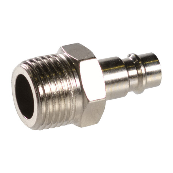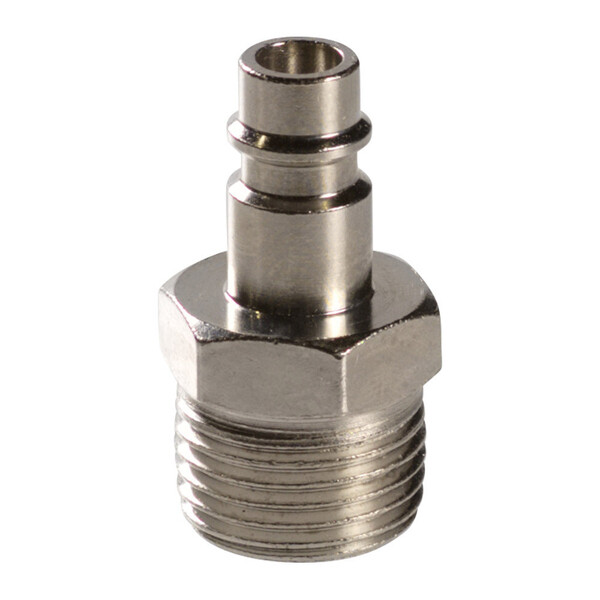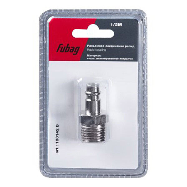 Переходник Fubag 180142 B применяется для соединения различных частей пневмосистем. С одной стороны фитинг имеет внешнюю резьбу – 1/2", с другой быстросъемное соединение – рапид штуцер.
