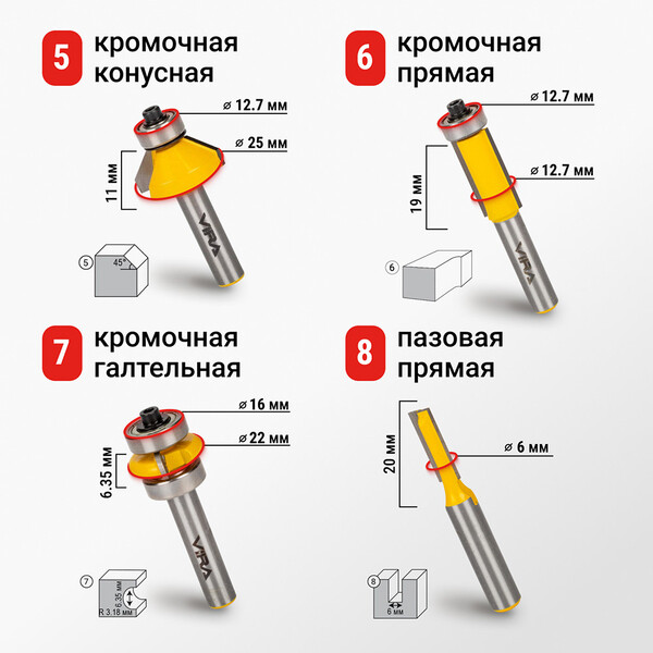| Форма фрезы | V-образная, Галтельная, Калевочная, Конструкционная, Конусная, Прямая |