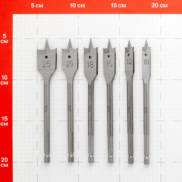 Для сверления отверстий в массиве древесины, древесно-плитных и листовых древесных материалах. Набор состоит из шести сверл. Диаметры сверл – 10, 12, 16, 18, 20, 25 мм.