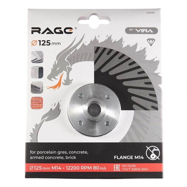 Предназначен для сухой резки и шлифовки бетона, гранита, мрамора, природного камня. Двухсторонний алмазный слой 25/10 мм армирует корпус, добавляя необходимую жесткость диску для криволинейной резки и шлифовки. Фланец М14 позволяет быстро устанавливать его на УШМ без зажимной гайки. Вынос диска на 20 мм дает возможность работать с материалом под любым углом. Посадочный диаметр самого диска 22,23 мм, для возможности использовать с УШМ отдельно от фланца. Возможно использование с охлаждающей жидкостью для увеличения ресурса, уменьшения запыленности помещения и улучшения качество реза.