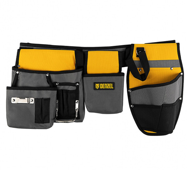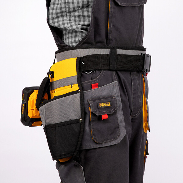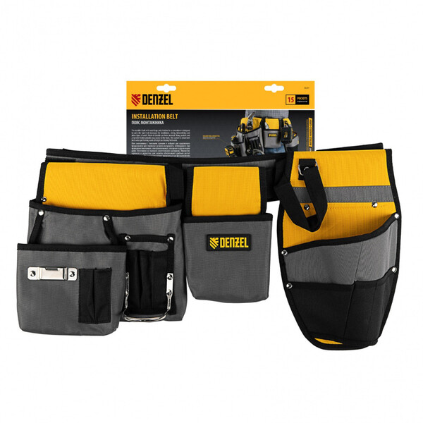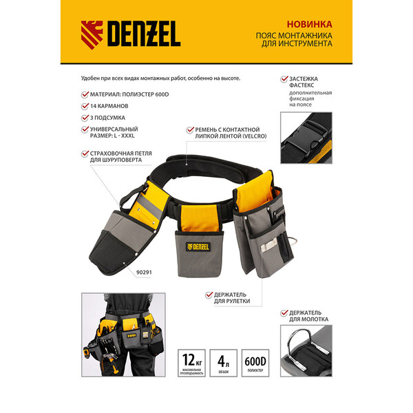 Пояс монтажника Denzel 90291 с поясными сумками и кобурой для шуруповерта позволяет иметь все необходимые инструменты под рукой во время высотных монтажных работ или решения других задач. В 14 карманах и дополнительном подсумке можно разместить инструменты, крепеж и расходники. Для шуруповерта предусмотрена специальная кобура со страховочной петлей.