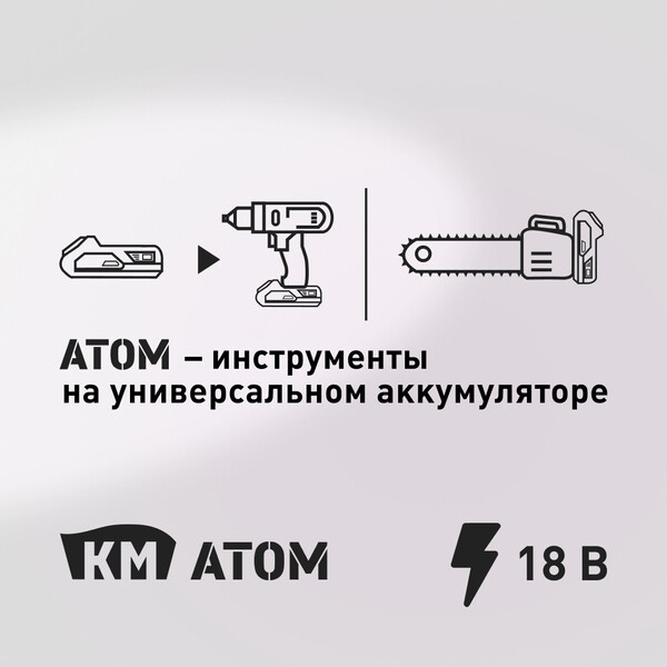 Этот инструмент входит в состав аккумуляторной платформы КМ АТОМ. Все инструменты и садовая техника данной серии работают от универсальных аккумуляторов КМ АТОМ. Мини-пила цепная аккумуляторная предназначена для отпиловки и распиловки небольших веток деревьев диаметром не более 120 мм, посредством движущейся пильной цепи, приводимой в движение электродвигателем. Внимание! Зарядное устройство и аккумуляторная батарея в комплект не входят.