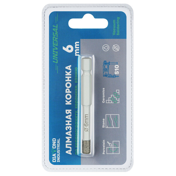 Алмазная коронка предназначена для сверления керамической плитки, керамогранита, гранита, мрамора. Коронки изготовлены по технологии вакуумного спекания алмазов. Отличаются повышенным ресурсом и возможностью сверления без охлаждения водой.