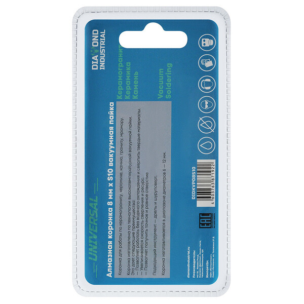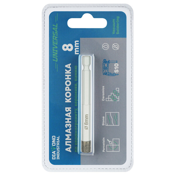 Алмазная коронка предназначена для сверления керамической плитки, керамогранита, гранита, мрамора. Коронки изготовлены по технологии вакуумного спекания алмазов. Отличаются повышенным ресурсом и возможностью сверления без охлаждения водой.