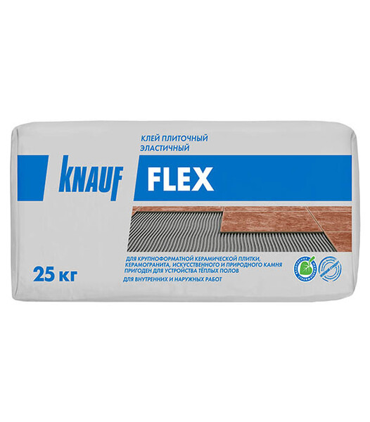 Смесь Кнауф-Флекс предназначена для облицовки внутри и снаружи зданий (включая цоколь): стен керамической плиткой, керамогранитом, природным и искусственным камнем. Рекомендуется для облицовки поверхностей с повышенными нагрузками и высокой проходимостью, отапливаемых полов, террас, балконов,деформируемых оснований (например ЦСП). Применяется для облицовки чаш крытых бассейнов. Класс клея согласно ГОСТ Р 56387-2018 – C2 TE S1 Полное нагружение возможно через 7 дней.