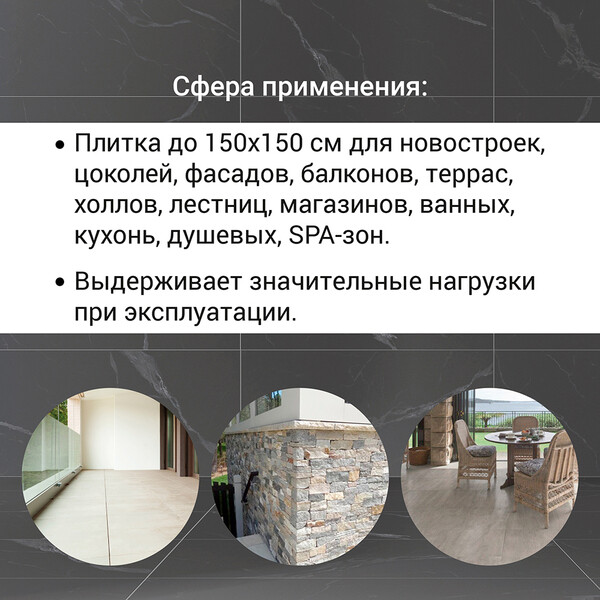 Для укладки облицовочных плит любого формата из керамогранита (в т.ч. с размером грани плитки – до 1,5 м), керамики, натурального и искусственного камня, клинкерной плитки. Применяется для внутренних и наружных работ при облицовке стен и полов в помещениях жилого, административного и промышленного назначения: квартиры, магазины; облицовка фасадов; балконов; террас; цоколей и бассейнов. Для облицовки поверхностей, подверженных деформационным нагрузкам: входных групп в здание; облицовка лестничных маршей и площадок; облицовка промышленных цехов и складских зон; паркингов; промышленных полов, ж/д вокзалов; подземных переходов, станций метро, аэропортов и т.д. Для облицовки нагреваемых поверхностей: теплых полов; печей и каминов до +120 C.