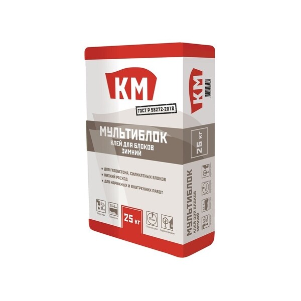 Сухая строительная смесь на основе портландцемента, фракционированного песка и модифицирующих добавок предназначена для тонкослойной укладки – стеновых плит и блоков из ячеистых бетонов (газобетона, пенобетона), силикатных и поризованных керамических блоков. При необходимости раствор может применяться для последующего выравнивания (шпатлевания) блоков. КМ Мультиблок существенно снижает вероятность образования «мостиков холода», повышая таким образом теплоизолирующие свойства конструкции. Клей используется для наружных и внутренних работ. В составе материала содержатся специальные противоморозные добавки, позволяющие проводить работы при отрицательных температурах (до -15 °С). Температура применения клея от -15 до +25 °C.