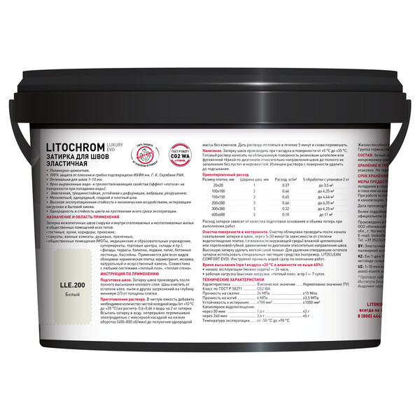 LITOCHROM LUXURY EVO — эластичная водоотталкивающая цементно-полимерная затирка с защитной системой LitoProtect® для заполнения межплиточных швов шириной 1–10 мм включительно. Смесь с пониженным водопоглощением, с повышенной стойкостью к истиранию, относится к классу CG2WA согласно классификации ГОСТ Р 58271. Предназначена для затирки швов при облицовке стен и полов керамической плиткой, стеклянной мозаикой, керамогранитом, натуральным камнем, агломератом.