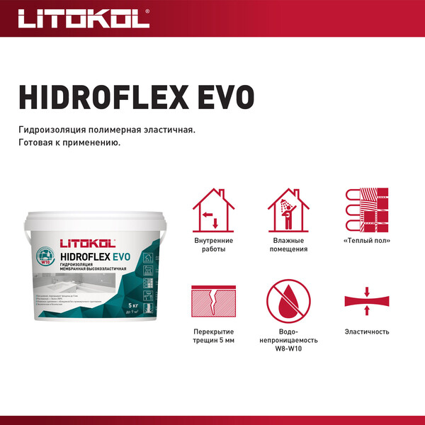 Готовый состав для проведения гидроизоляционных работ в ванных комнатах, туалетах, душевых, кухнях. Применяется по цементной и гипсовой штукатурке, стяжках (в том числе с подогревом), бетону, гипсокартону и т.п. Образует эластичное покрытие, пригодное для выполнения плиточных облицовок. Имеет цветной индикатор для контроля равномерного нанесения.