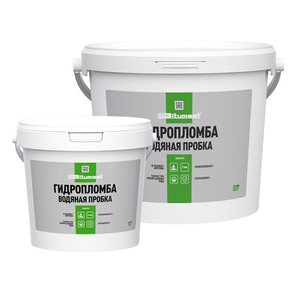 Bitumast водяная пробка – безусадочный гидроизоляционный однокомпонентный состав, представляющий собой сухую строительную смесь серого цвета. В состав материала входят портландцемент, кварцевый наполнитель и активные химические добавки. Перед применением состав затворяют водой. Оперативное устранение протечек и фильтрации воды через трещины, стыки и отверстия в условиях постоянного водопритока. Водяная пробка предназначена для затворения водой комнатной температуры. Время схватывания раствора при температуре воды затворения +20°С составляет 1-3 минуты. Преимущества – средний расход сухого материала 1,7 кг/дм³ – быстро схватывается – работает при воздействии высокого гидростатического давления – безусадочный шов – не содержит веществ, вызывающих коррозию бетона и арматуры