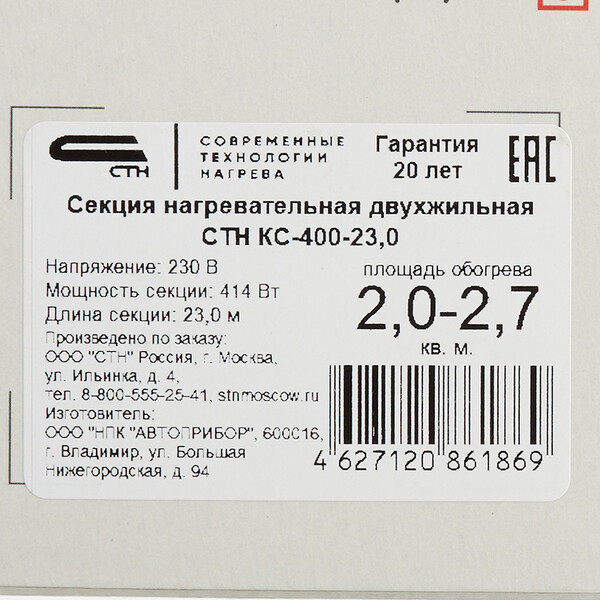 Теплый пол кабельный СТН Квадрат тепла КС-400-23 2-2,67 кв.м 400 Вт 23 м