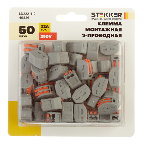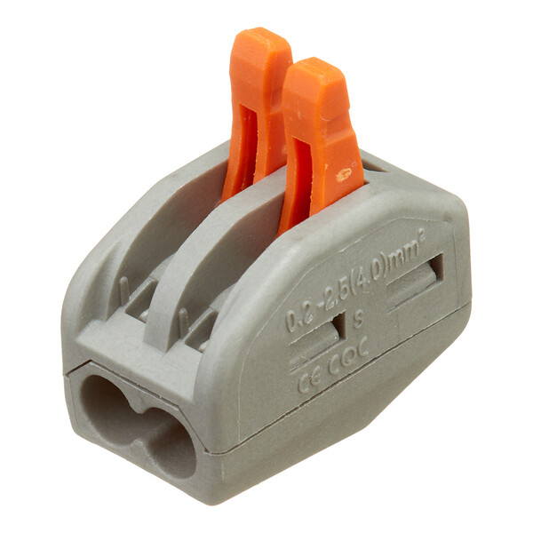 Предназначена для быстрого и надежного монтажа электропроводки. Незаменима везде, где необходимо подключить большое количество многожильных и одножильных проводников в минимальном пространстве. лемма пружинная универсальная Stekker LD222-412, 2-проводная 0,08 – 2,5/4 мм?, 400 В, максимальный ток для одножильного проводника – 24 A, для многожильного – 32 A, без пасты, материал изделия – нейлон, латунь. Тип провода, который можно подключать – одножильный и многожильный, материал подключаемого проводника – медь, температура окружающей среды -20...+40°C Клемма хорошо защищена от прикосновения к токоведущим частям, имеет тестовое отверстие. Чтобы подсоединить проводник, всего лишь нужно поднять оранжевый рычажок на клемме вверх до фиксации. При этом открывается окно для ввода проводника, ввести проводник со снятой изоляцией (на клемме...