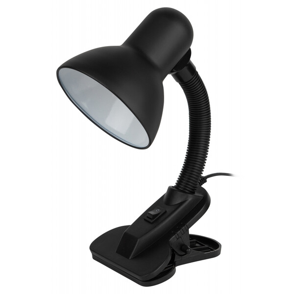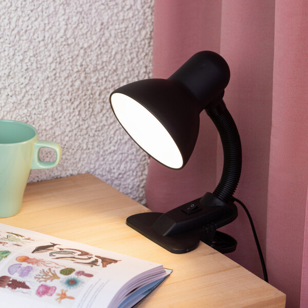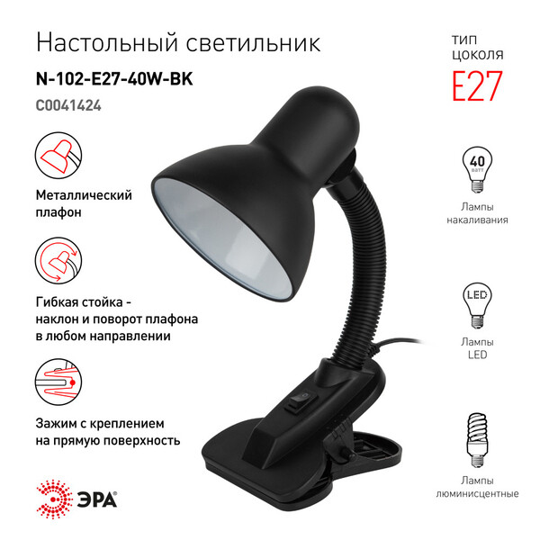 Настольный светильник-прищепка ЭРА N-102-E27-40W-BK может использоваться с лампой накаливания, компактной люминесцентной лампой (КЛЛ) или светодиодной (LED) лампой. У светильника прочная удобная прищепка и металлический плафон. Наклон и поворот плафона в любом направлении для удобного направления света. Поставляется в индивидуальной картонной коробке.