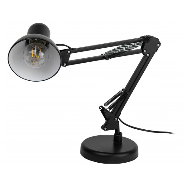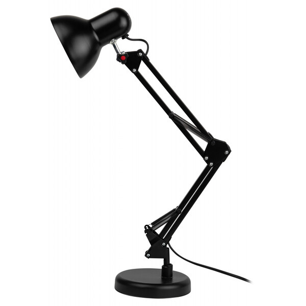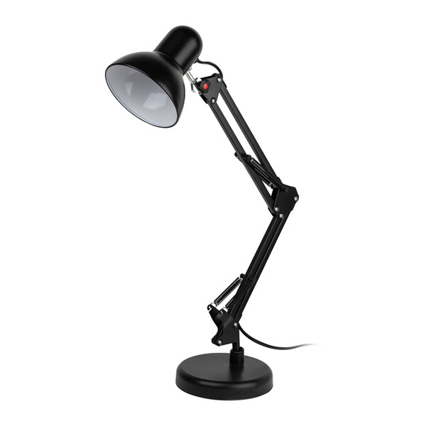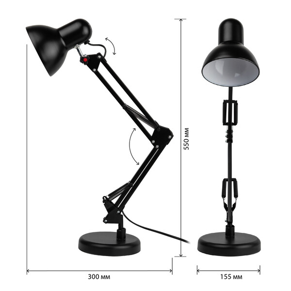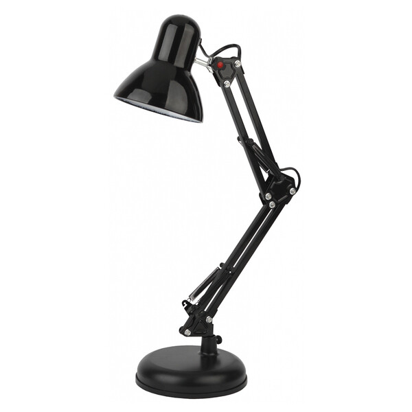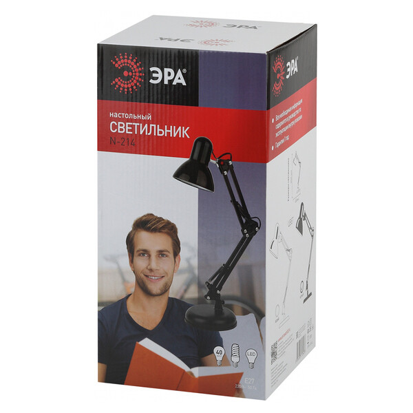 Настольный светильник ЭРА N-214-E27-40W-BK черный. Настольная лампа может использоваться с лампой накаливания, компактной люминесцентной лампой (КЛЛ) (стандартный цоколь Е27) или светодиодной (LED) лампой. Устойчивое основание, металлические стойка и плафон. Высота плафона регулируется двухсекционной сгибающейся стойкой. Выключатель на проводе.