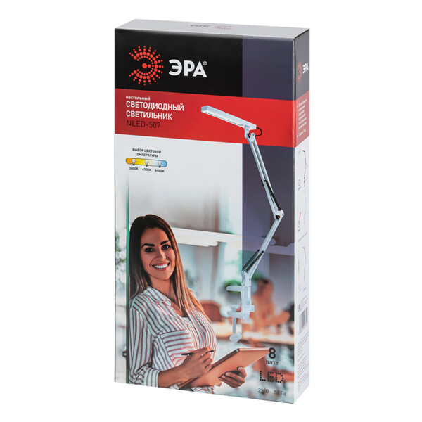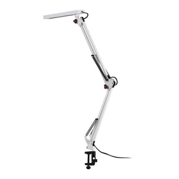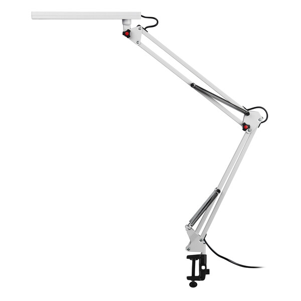 Светильник со светодиодами (LED) в качестве источников света. Модель на струбцине. Выключатель на проводе. Изменяемая цветовая температура – 3000К/4500К/6000К. Высота плафона регулируется двухсекционной сгибающейся стойкой, направление света регулируется поворотом плафона в любом направлении.