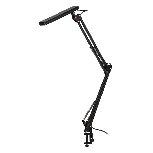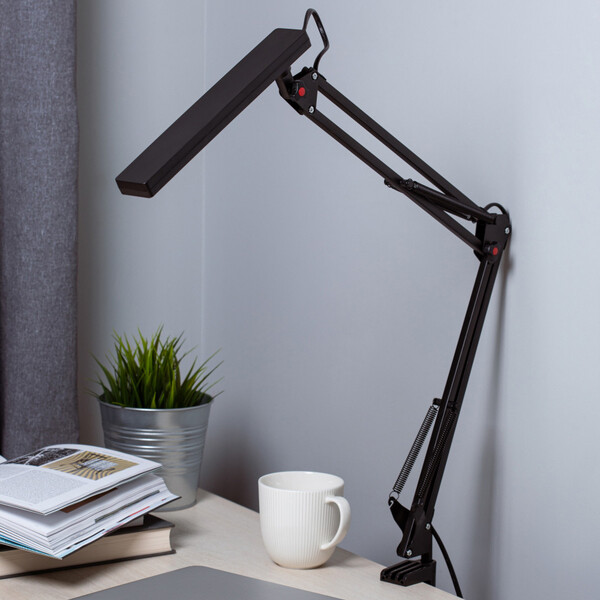 Светильник со светодиодами (LED) в качестве источников света. Модель на струбцине. Выключатель на проводе. Изменяемая цветовая температура – 3000К/4500К/6000К. Высота плафона регулируется двухсекционной сгибающейся стойкой, направление света регулируется поворотом плафона в любом направлении.