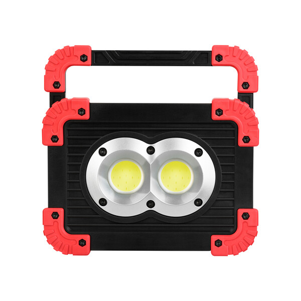 Предназначен для уличного освещения. Аккумуляторный прожекторный фонарь с двумя источниками света на линзованных COB-диодах общей мощностью 10 Вт и дополнительным боковым светильником. Срок службы светодиодов составляет 100 000 часов. Прожектор работает в трех режимах: яркий, приглушенный и вспышка. Корпус выполнен из прочного пластика, оборудован эргономичной регулируемой ручкой для переноски и установки в нужном месте. Аккумулятор обеспечивает непрерывную работу на протяжении до четырех часов. Прожектор можно заряжать через USB-порт или от трех батареек типа АА (в комплект не входят), а также использоваться в качестве внешнего аккумулятора для подзарядки мобильных устройств. Повышенная защита от влаги и пыли позволяет применять фонарь в самых экстремальных условиях.