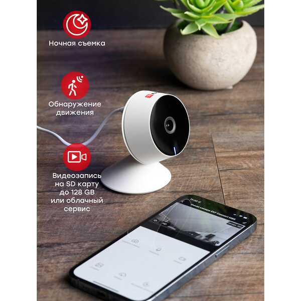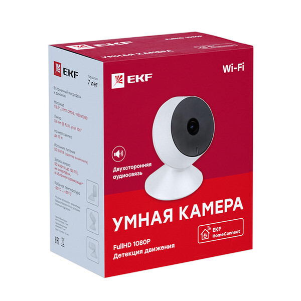 Предназначена для видеонаблюдения за домом или квартирой, а также для присмотра за детьми или питомцами. Можно в любой момент посмотреть картинку с камеры в приложении EKF Connect для Android и iOS. Есть ночной режим с инфракрасной подсветкой до 10 метров, также есть двусторонняя аудиосвязь (режим Видеоняни). Камера поддерживают запись видео на карту памяти и в облако, передачу по открытому протоколу ONVIF (оплата облачного хранилища российскими банковскими картами временно не работает). Поддерживается функция определения движения с отправкой уведомления и фотографии в приложение.