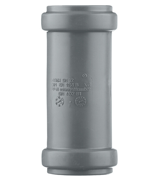 Внутренняя система канализации Ostendorf HT. Муфта двойная, предназначена для соединения безраструбных частей труб и фитингов, центральный упор внутри муфты обеспечивает соединение равных участков и в случае необходимости облегчает выставление отступа с расчётом на тепловое расширение.