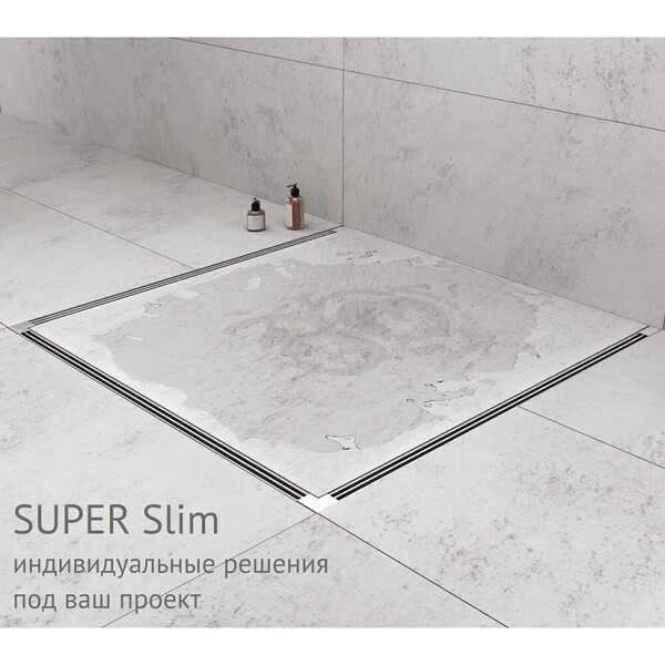 Решетка и декоративные заглушки. Нержавеющая сталь AISI 304. Комплект регулировки решетки по высоте от 8 до 30 мм. Сетка для волос – пластик. Комплект гидроизоляции. Желоб водосток – нержавеющая сталь AISI 304. Монтажная заглушка – пенопласт. Регулируемые по высоте ножки. Самопромывной S-образный сифон PP. Горизонтальный выпуск D50 H60 – пропускная способность 42л/мин, монтаж 360°. Монтажный ключ – пластик.