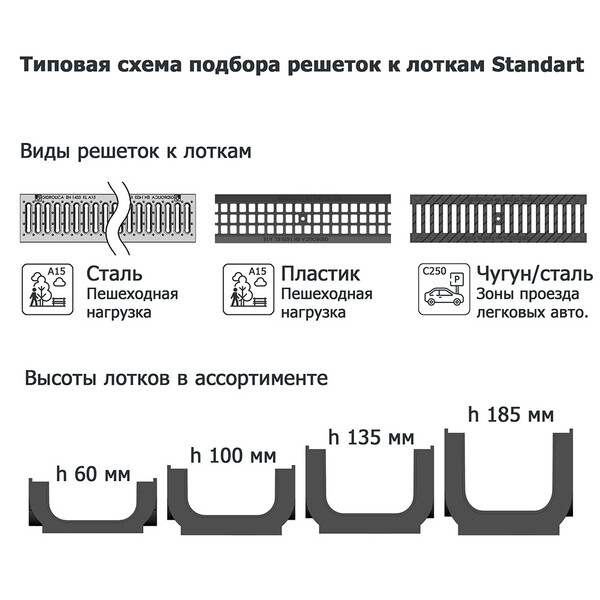 Предназначен для поверхностного водоотвода ливневых и талых вод в зонах с ограничением глубины заложения, например – в частном строительстве на террасах, балконах, в городах на подземных паркингах и кровле. Класс С250. Также лотки с небольшой высотой могут быть установлены в зонах, где не требуется большая пропускная способность лотка, в этом случае это будет более экономичное решение, чем применение лотков с большей высотой. Лоток для обеспечения безопасного движения через него рекомендуется накрывать решеткой в соответствии с предполагаемыми нагрузками в зоне заложения. Это могут быть чугунные решетки класса С250 для проезда легковых автомобилей, либо стальные штампованные оцинкованные или пластиковые решетки для зон пешеходной нагрузки. Все решетки к лоткам рекомендовано закрепить крепежом. Данные лотки имеют возможность соедине...