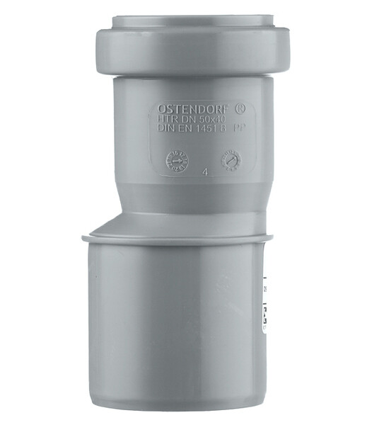 Внутренняя система канализации Ostendorf HT. Переход эксцентрический (редукция) предназначен для перехода с гладкой части трубы или фитинга меньшего диаметра на раструб трубы или фитинга большего диаметра. Переход выполнен снаружи раструба большего диаметра.
