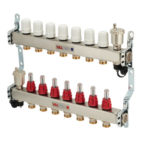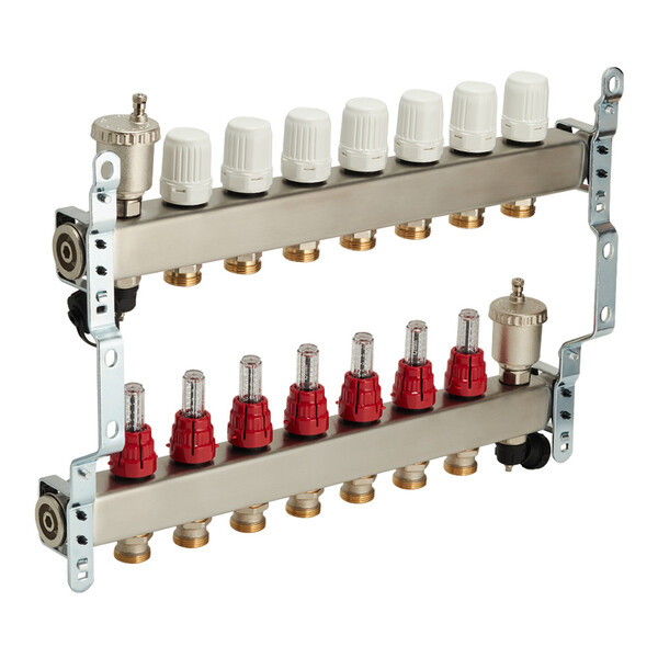 Предназначен для распределения потоков теплоносителя в системах отопления либо в системах водяных теплых полов. Состоит из подающего коллектора с семью ручными регулировочными клапанами с расходомерами и обратного коллектора с семью ручными запорными клапанами, на которые можно установить электротермические сервоприводы. Термостатические клапаны предназначены для изменения температуры отдельно в каждом контуре системы. Расходомеры обеспечивает равномерную циркуляцию теплоносителя по всей системе. Расстояние между выходами 50 мм. Выходы имеют наружную резьбу 3/4" (20 мм) под евроконус.