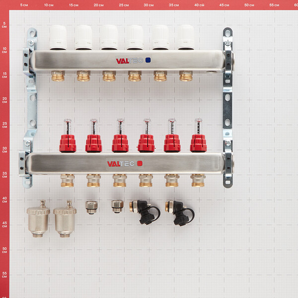 Предназначен для распределения потоков теплоносителя в системах отопления либо в системах водяных теплых полов. Состоит из подающего коллектора с шестью ручными регулировочными клапанами с расходомерами и обратного коллектора с шестью ручными запорными клапанами, на которые можно установить электротермические сервоприводы. Термостатические клапаны предназначены для изменения температуры отдельно в каждом контуре системы. Расходомеры обеспечивает равномерную циркуляцию теплоносителя по всей системе. Расстояние между выходами 50 мм. Выходы имеют наружную резьбу 3/4" (20 мм) под евроконус.