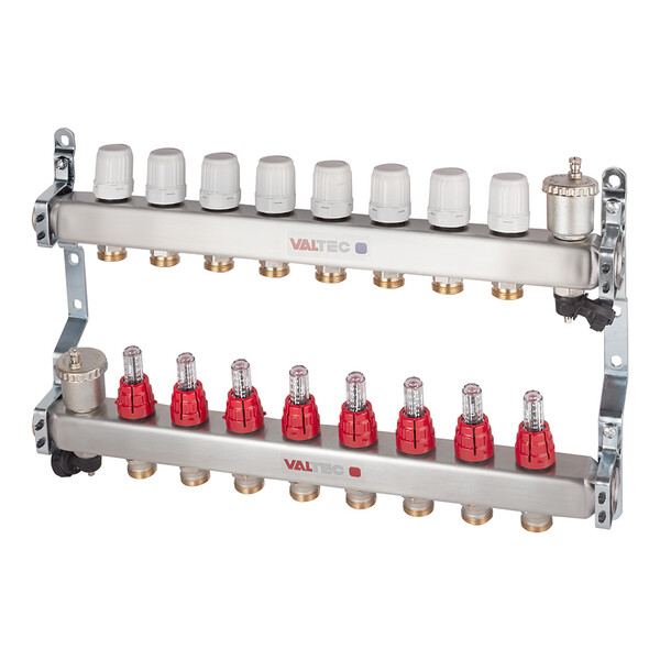 Предназначен для распределения потоков теплоносителя в системах отопления либо в системах водяных теплых полов. Состоит из подающего коллектора с восемью ручными регулировочными клапанами с расходомерами и обратного коллектора с восемью ручными запорными клапанами, на которые можно установить электротермические сервоприводы. Термостатические клапаны предназначены для изменения температуры отдельно в каждом контуре системы. Расходомеры обеспечивает равномерную циркуляцию теплоносителя по всей системе. Расстояние между выходами 50 мм. Выходы имеют наружную резьбу 3/4" (20 мм) под евроконус.