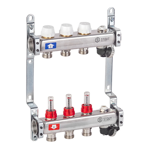 Коллекторная группа с расходомерами нержавеющая сталь Stout 1 ВР(г) х 3 выхода 3/4 НР(ш) ЕК х 1 ВР(г