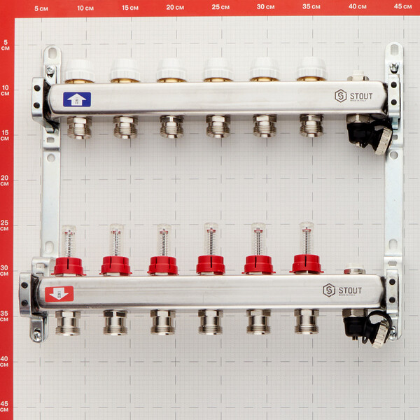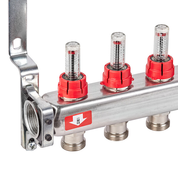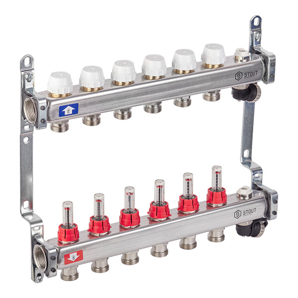 Предназначена для распределения потоков теплоносителя в системах радиаторного отопления, либо в системах водяных теплых полов. Состоит из подающего коллектора с шестью ручными регулировочными клапанами с расходомерами и обратного коллектора с шестью ручными запорными клапанами, на которые можно установить электротермические сервоприводы. Термостатические клапаны предназначены для изменения температуры отдельно в каждом контуре системы. Расходомеры обеспечивает равномерную циркуляцию теплоносителя по всей системе. Расстояние между выходами 50 мм. Выходы имеют наружную резьбу 3/4" (20 мм) под евроконус.