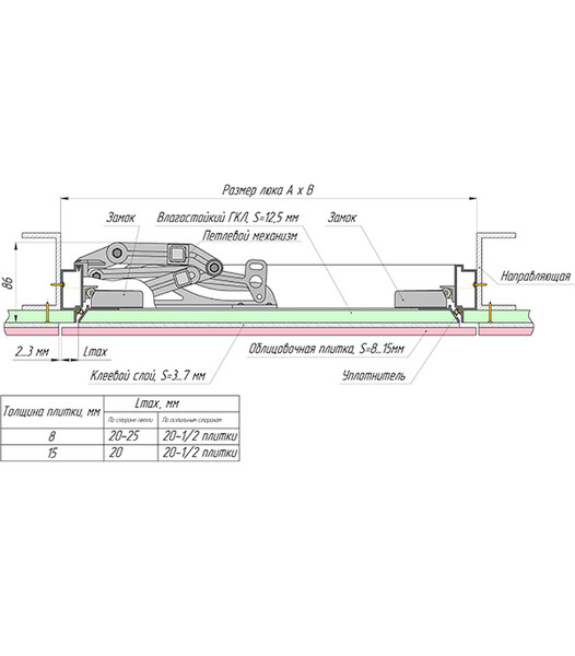 Предназначен для скрытого доступа к инженерным, вентиляционным, сантехническим, электрическим коммуникациям, а также к скрытым нишам. Устанавливается в любые подготовленные к монтажу проёмы из кирпича, бетона, гипсокартона, дерева. Возможна отделка практически любыми отделочными материалами толщиной до 20 мм: плитка, керамогранит, керлит, зеркало и т.д. Силиконовый уплотнитель защищает от влаги и неприятных запахов. Не требует подрезки плитки, потому как оклеивается отделочными материалами внахлест, что позволяет сохранять раскладку на люке идентичной раскладке материалов на остальной части стены, оставляя люк невидимым. Открывается нажатием, закрывается одним движением. За счет запатентованной системы умной петли, открывается и закрывается по заданной траектории, автоматически центрируя дверцу относительно проема, что исключает ска...