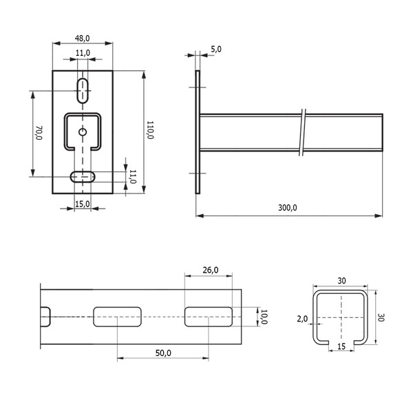 Консоль подходит для монтажа к перекрытиям. Для удобства монтажа крепёжные отверстия размещены под углом 90". Подходит для монтажа внутри и снаружи зданий.